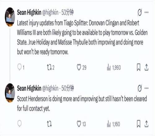 北京时间12月14日,据开拓者队记Highkin报道,主帅斯普利特更新了球队的伤情:克林根与罗威大概率可出战明日对阵勇士队的比赛。朱-霍勒迪、赛布尔的伤情均有所好转,训练参与度也逐步提升,但明日暂无法登场。亨德森的恢复情况正持续向好,训练量也在增加,不过目前仍未获准参与全对抗训练。