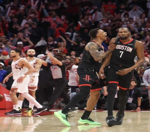 在比赛最后5.1秒的时候,双方战成97平,这个时候火箭的目标很明确,那就是交给杜兰特。杜兰特持球面对防守球员,直接无视对手,直接干拔三分,即便是此前11投1中又如何?球空心入网,火箭全场疯狂庆祝,杜兰特这边也是霸气挥手向着太阳再见。要知道,杜兰特上赛季正是效力于太阳,不过未能取得成功,最终双方不欢而散。